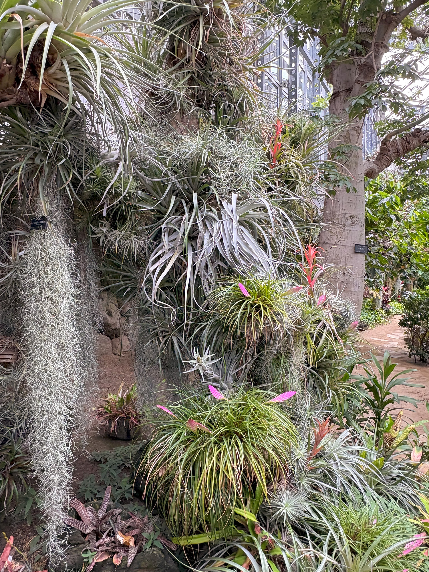 大阪・鶴見緑地公園にある「咲くやこの花館」のブロメリアコーナー。 原生地でこのように豊富な種類が一カ所にまとまることはなさそうだが、野性味あふれる生き生きとした様は、そこで歩みが完全に止まってしまうほど魅力的。 ブロメリア独特の魅力を堪能できる場所である。 |