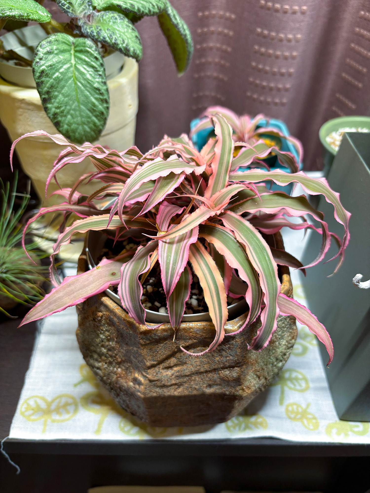 親株にピンクの色味が出たのは完全に初めてです。ゼブラ柄もありませんし、この親株の生育環境が、かなり暗めだったことが想像できますね。しかしこんなにピンクに発色するなんて!子株をそのうち切り離して、カッコよく育てちゃうぞー!