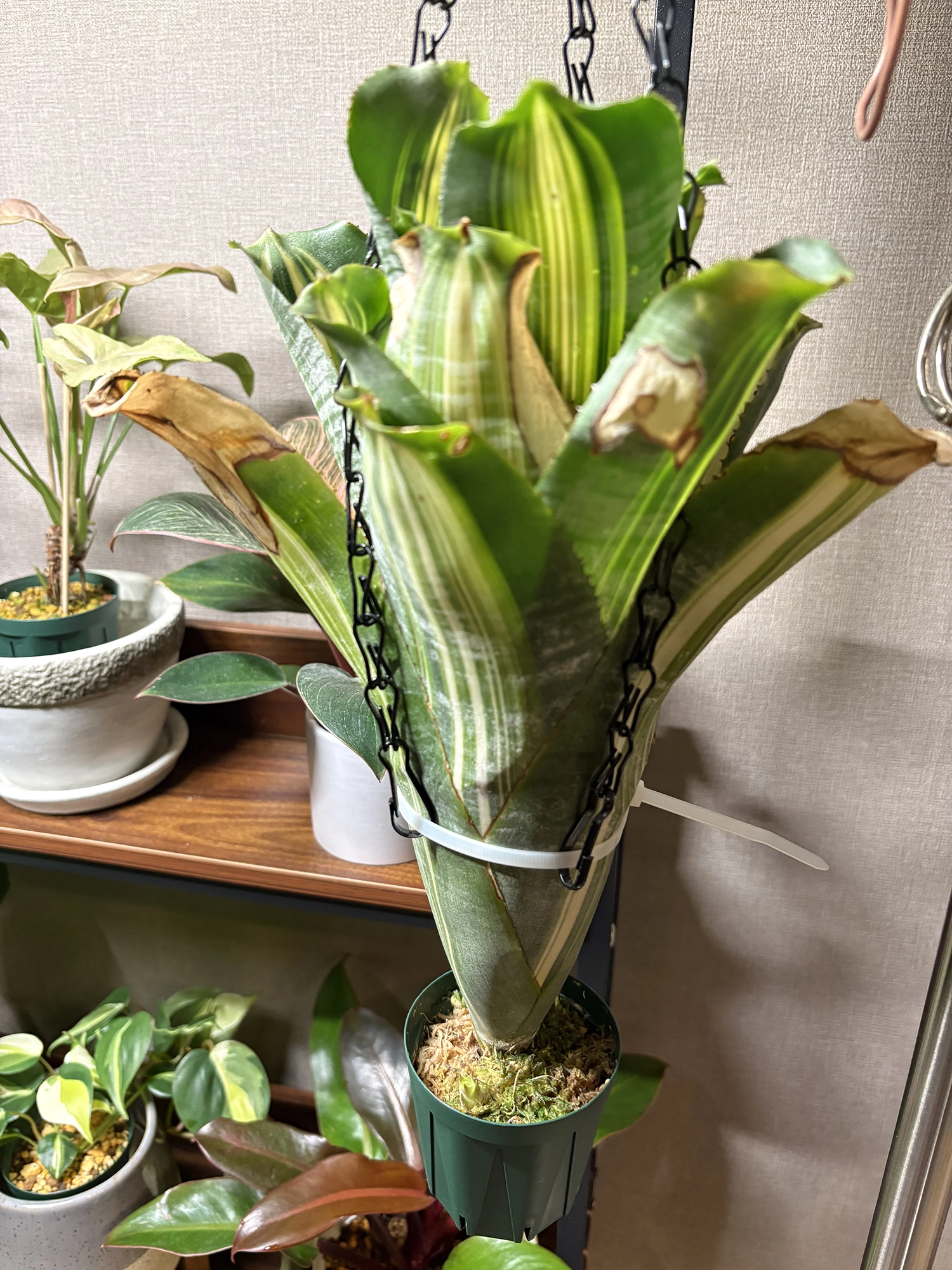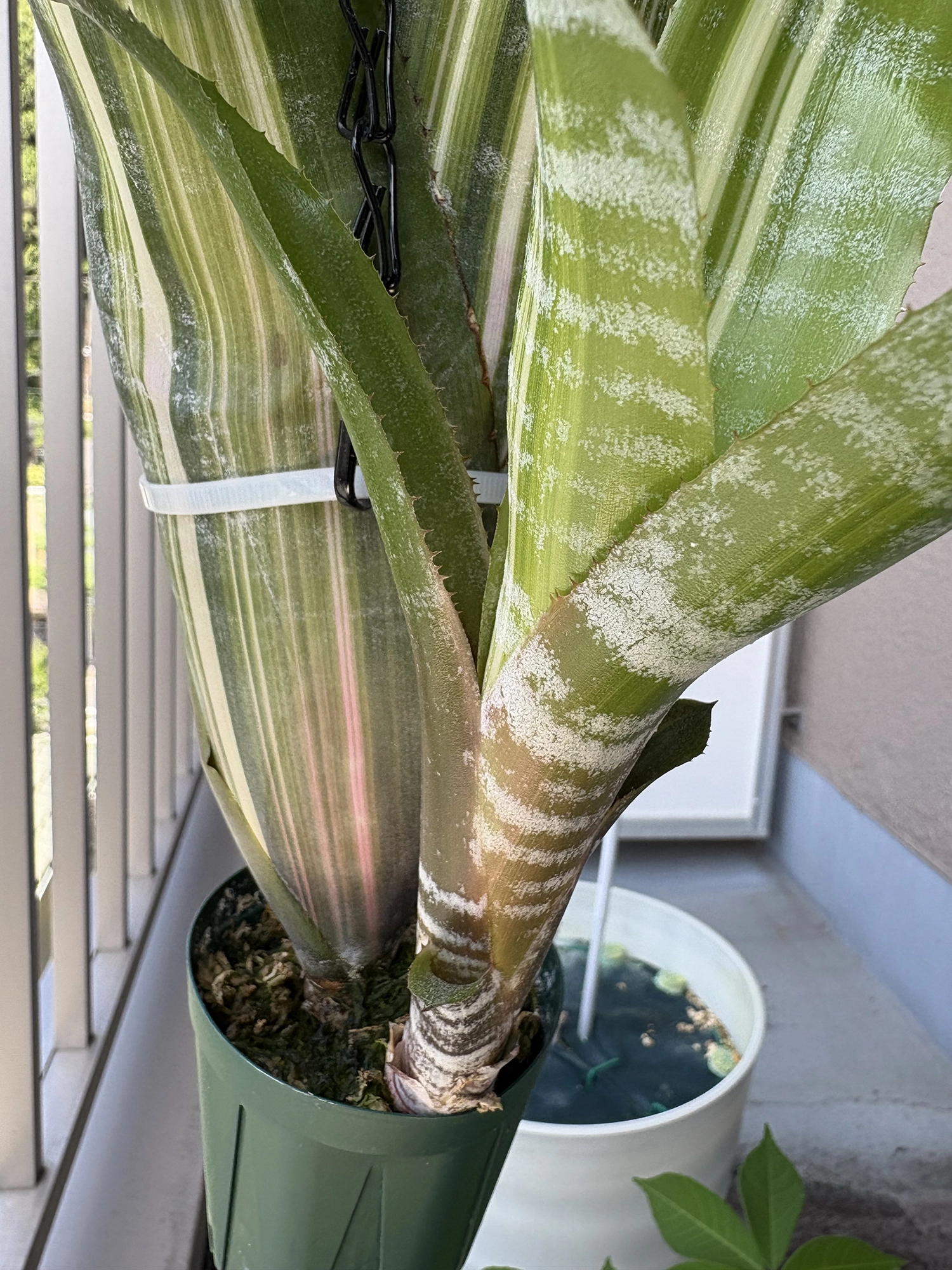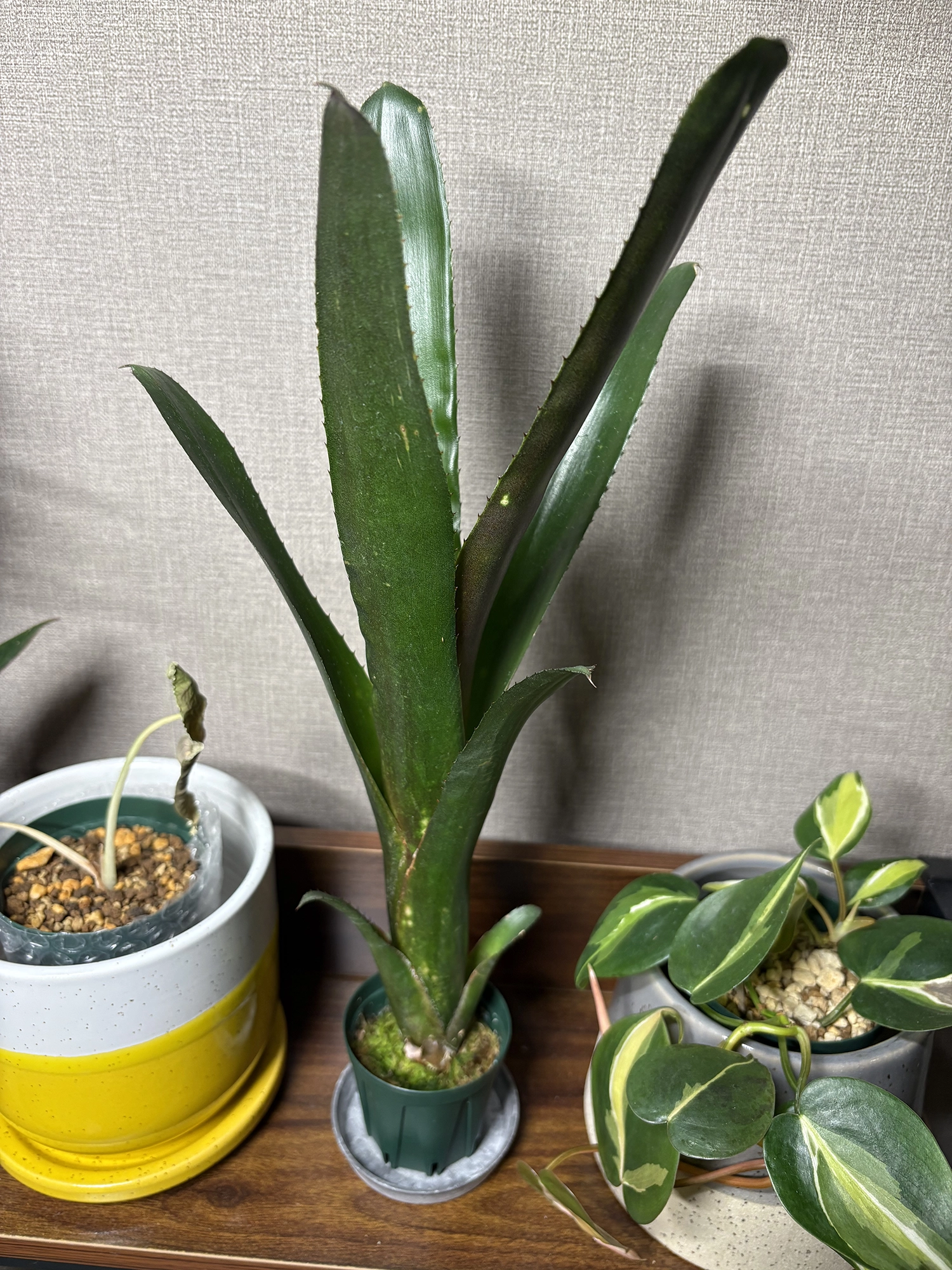 ![]() エクメア ファシアータ 中斑 購入時からあまり状態が良くなく、子株を吹かせることのみを考えて管理。 |