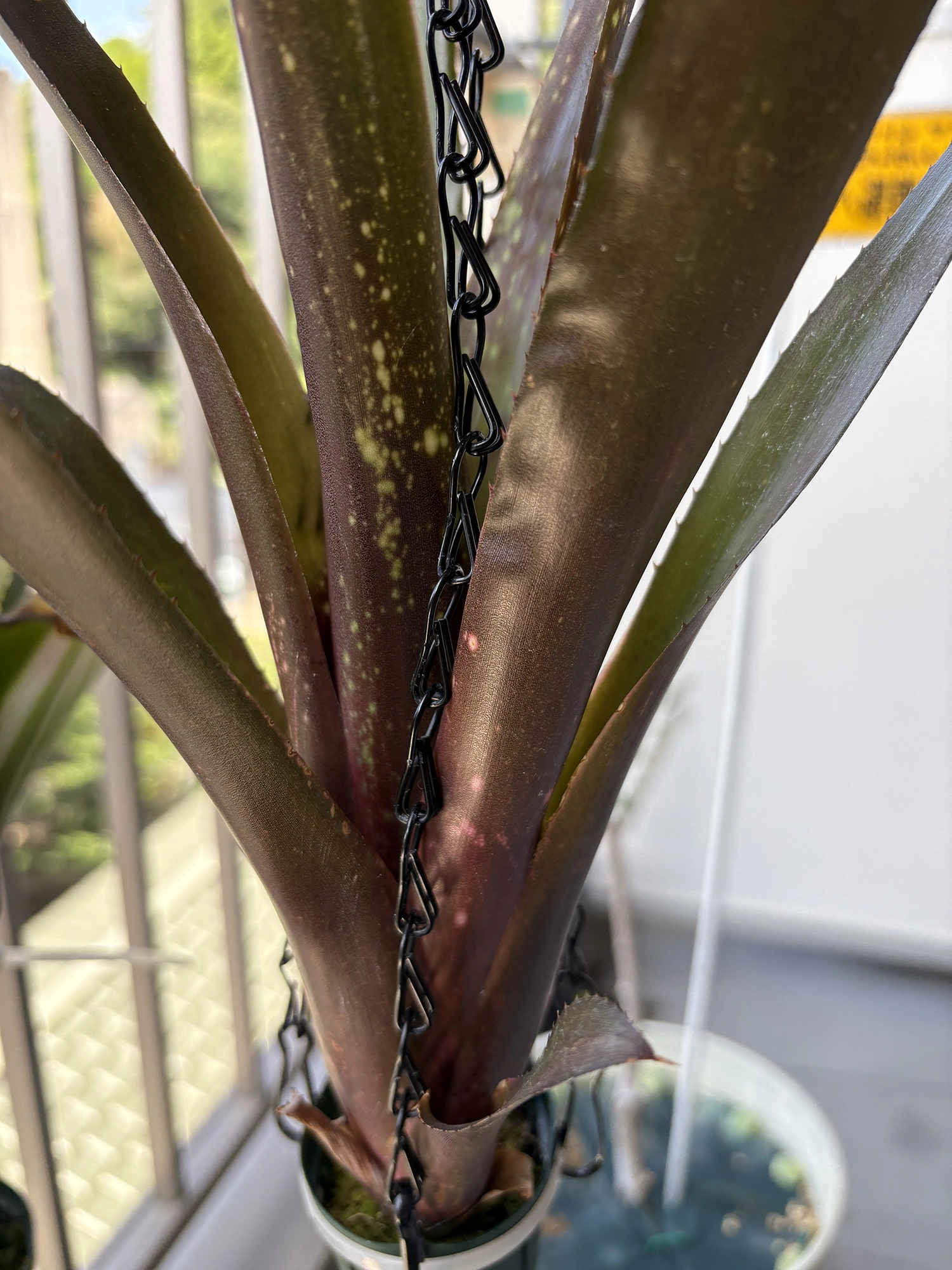 光不足で発色に変化が出るのは、タンクブロメリアが非常にわかりやすいです。