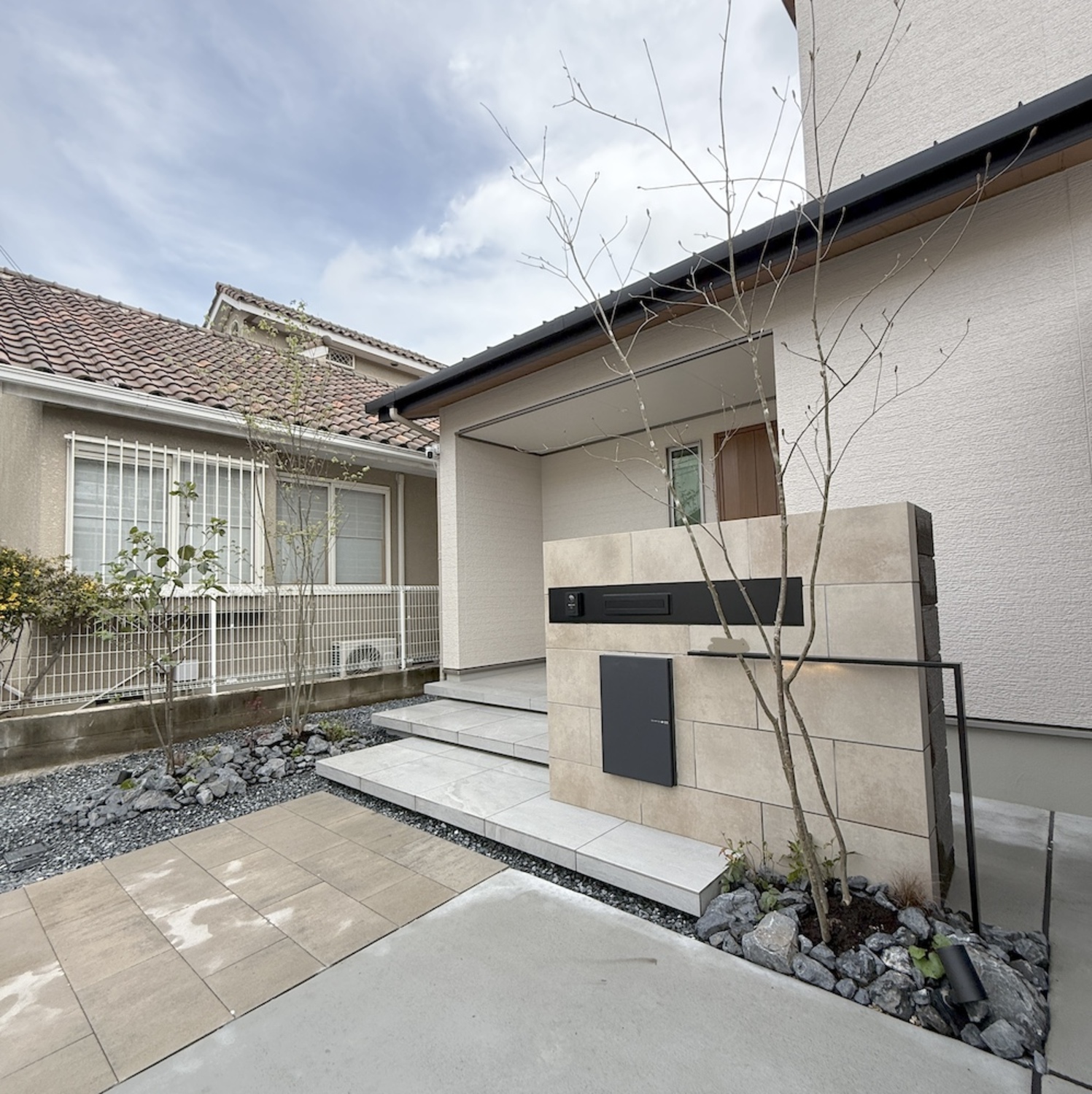 またタイルも一般的な30cm角ではなく、60cm角の大判タイルを使用することで、広々としたアプローチ階段になりました。