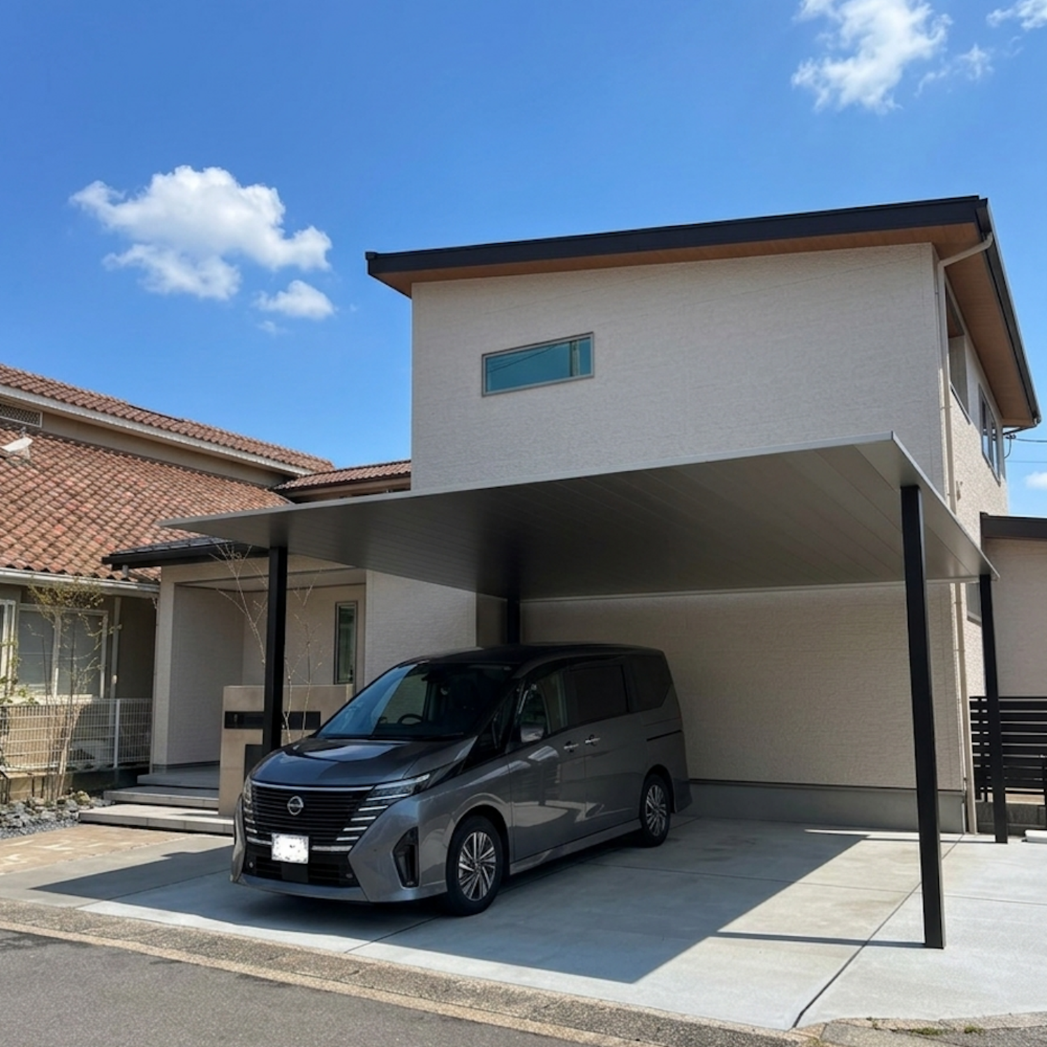 ご主人こだわりのカーポートはYKK APのプレーンルーフ。アルミ天井で高級感漂うことはもちろん、すっきりとしたデザインで無理なくお車を停めていただけます。