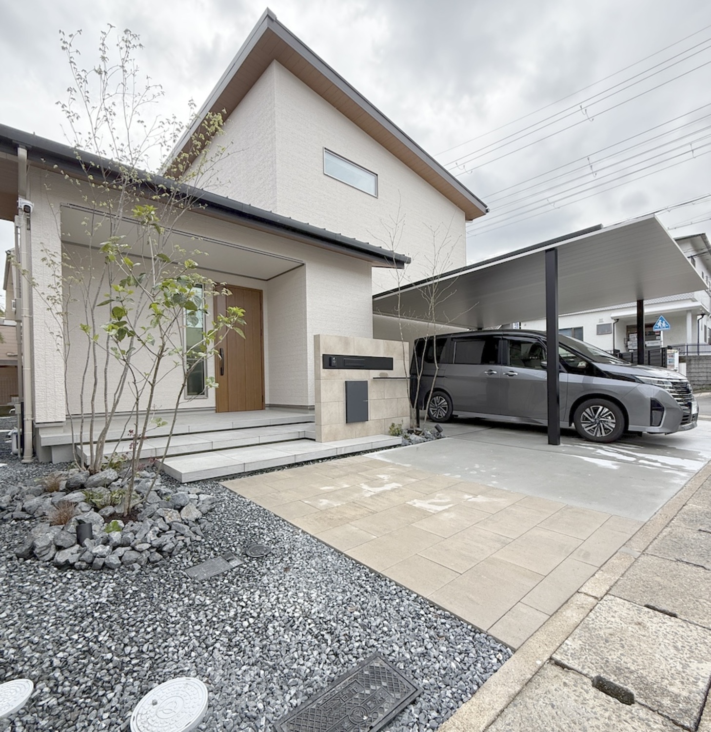 全体的にモノトーン、クールな雰囲気にせず、温かみのある色、素材で建物とも馴染んだアプローチ、門周りに。